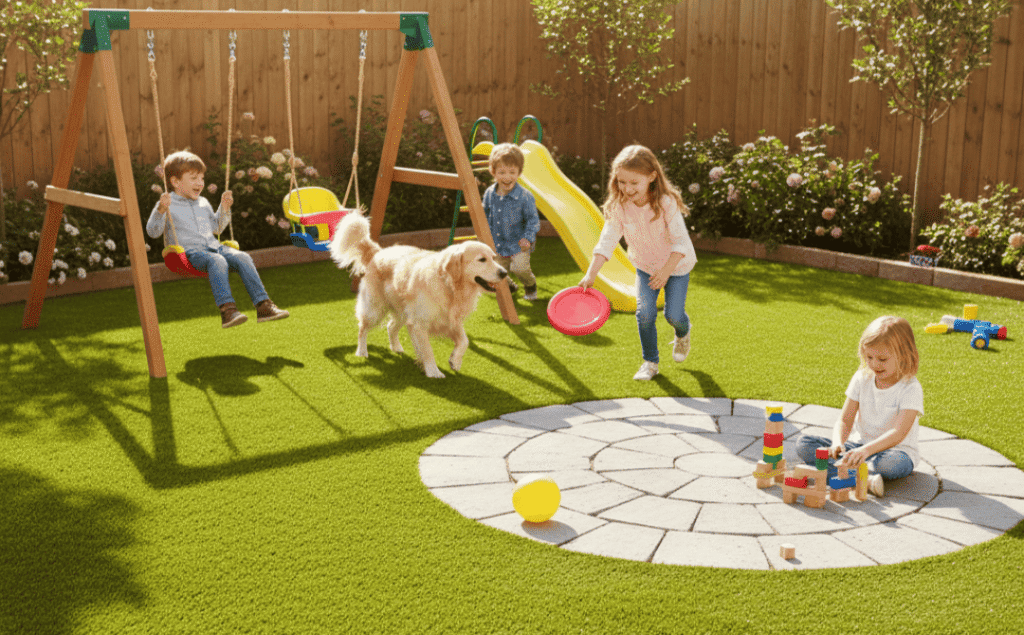 For pet owners who ask, “Is artificial turf good for dogs?” the answer is usually yes. Dogs stay clean, and turf drains well, so no smell lingers. Plus, parents do not have to worry about kids slipping in mud.